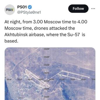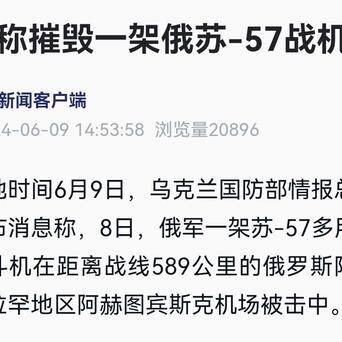 世界上第一架战损的五代机出现了?!据央视新闻客户端援引乌克兰方面的消息称,距离前线近600公里的阿赫图宾斯克空军基地部署的一架苏-57被乌克兰方面击中,有消息称乌克兰方面使用的是无人机,袭击时间发生在莫斯科时间凌晨3~4点。